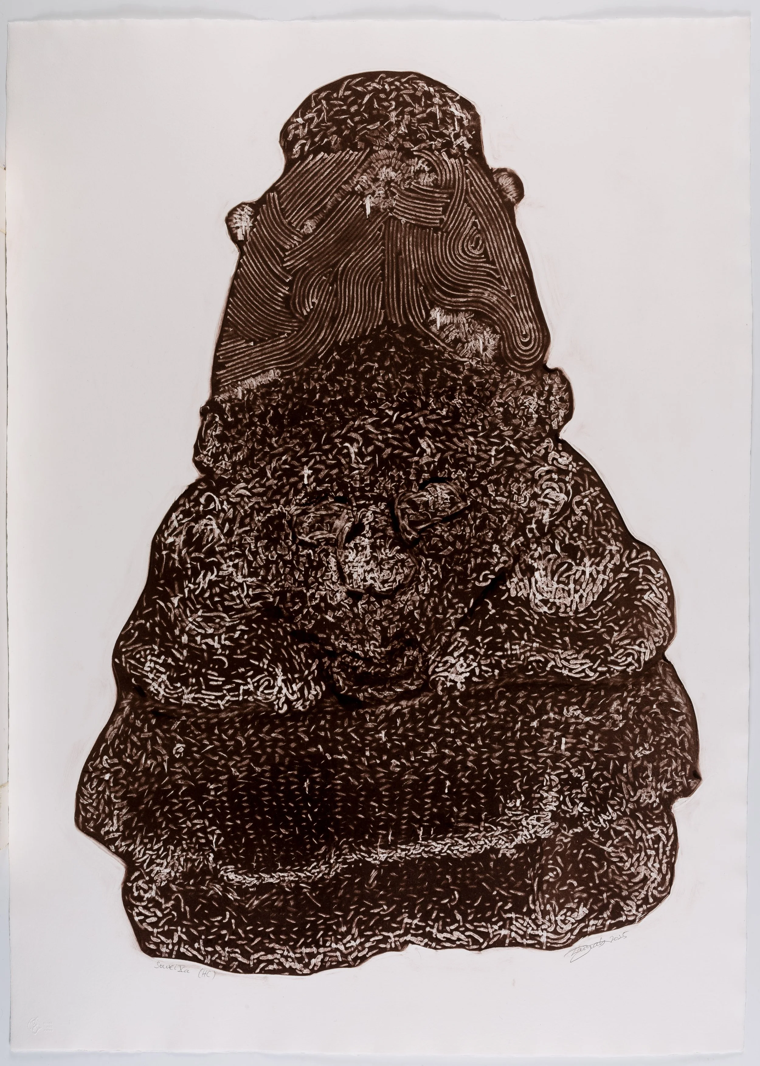 pochoir monotype printed in brown/black